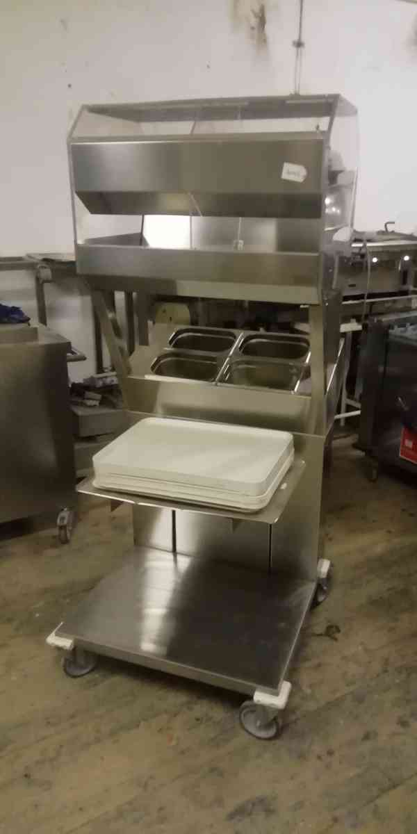 Vozík na tácy, pečivo, příbory atd., využijete hlavně v jídelně, restauraci, hotelu, bufetu, catering atd. Nové, nepoužité, posuvná police na tácy nebo menážky atd., prostor na příbory, výdejní prosklený box na pečivo, rozměr 1720 x 800 x 710 mm. Původní cena 29.990,- Kč, výprodejová cena 12.990,- Kč + doprava. (kód: D0619-42)